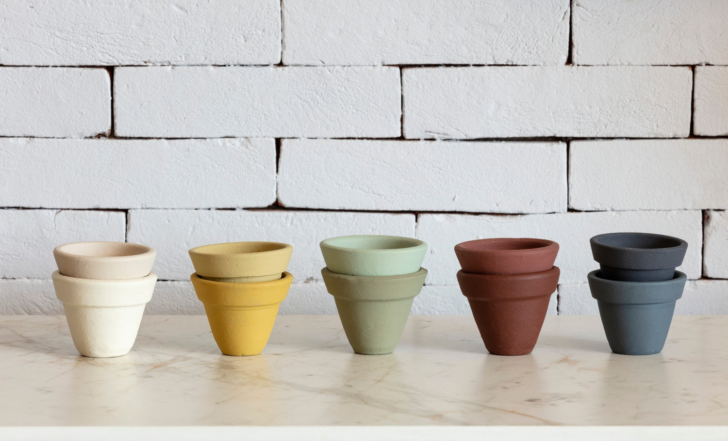 Para os vasos, o estudo de cores foi feito junto com os clientes no estúdio. E assim, chegou-se a uma paleta de 10 cores, que foi reduzida posterimanete para fechar o conjunto.